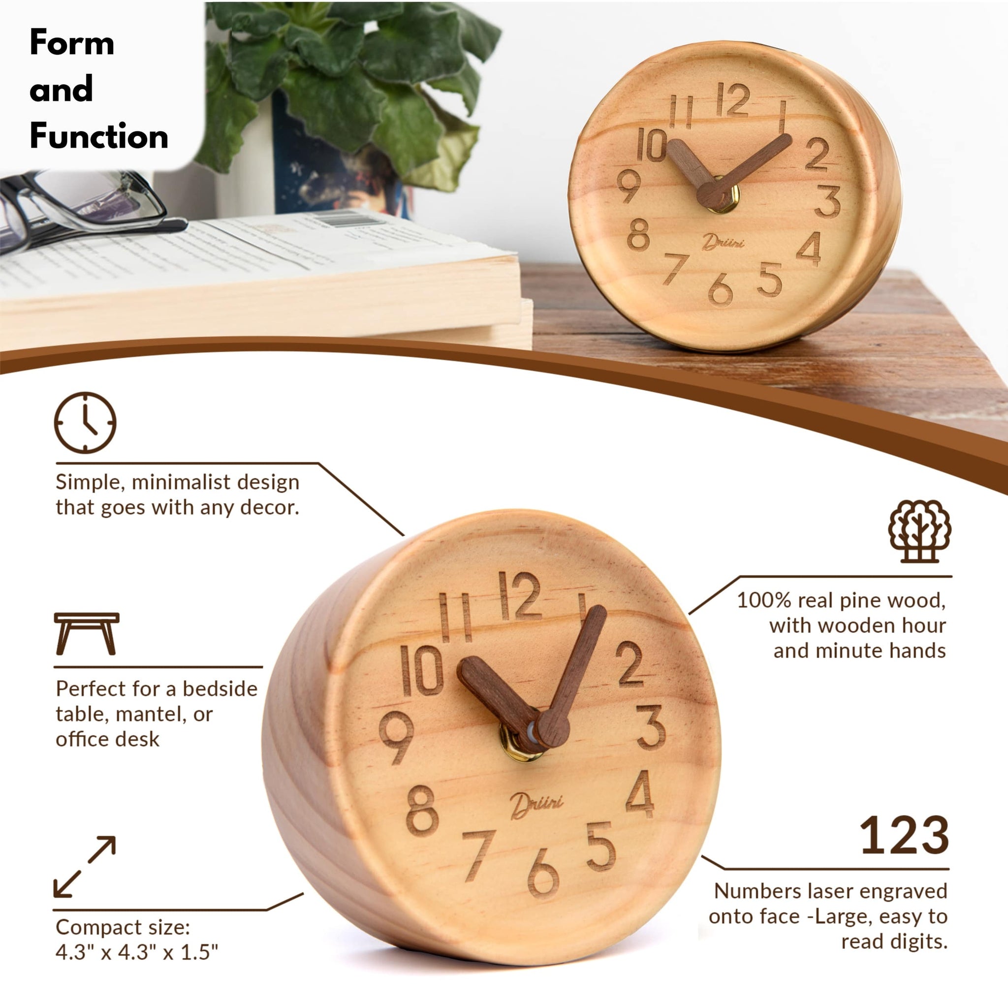 - DRIINI MEANS DESIGN – Choose us for unique aesthetics, minimalist simplicity, and no-nonsense function. Your analog pinewood shelf clock is backed by our commitment to your complete satisfaction.