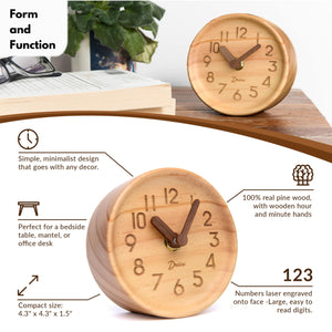 The Driini Analog Pine Wood Desk Clock is a one-of-a-kind solid wood clock made of genuine pine. It features a precision quartz sweep inner movement mechanism, which quietly and accurately maintains time without ticking. The richly colored, single wood piece frame and face has easy-to-read laser engraved numbers. The unvarnished wood hour and minute hands offer a beautiful contrast and are visible in low light. The clock is sized perfectly for a desk, bathroom countertop, or bedside table corner. It requires just a single AA battery to run long-term (not included).