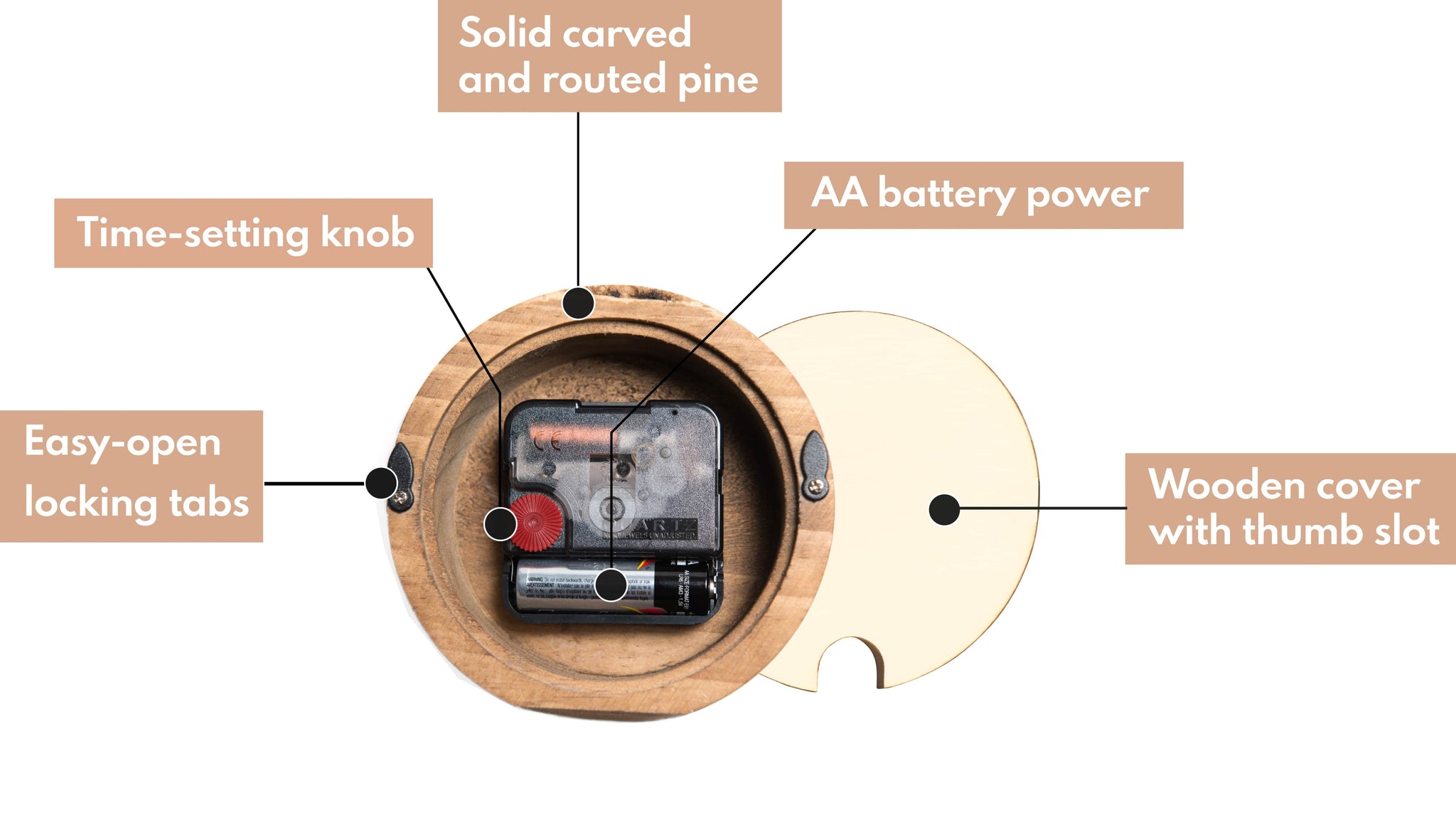 - SIMPLE SETUP – Put a single AA battery (not included) behind the wooden backplate and turn the setting knob to your desired time. Watch as the silent hands start to glide through the hours—that’s it!